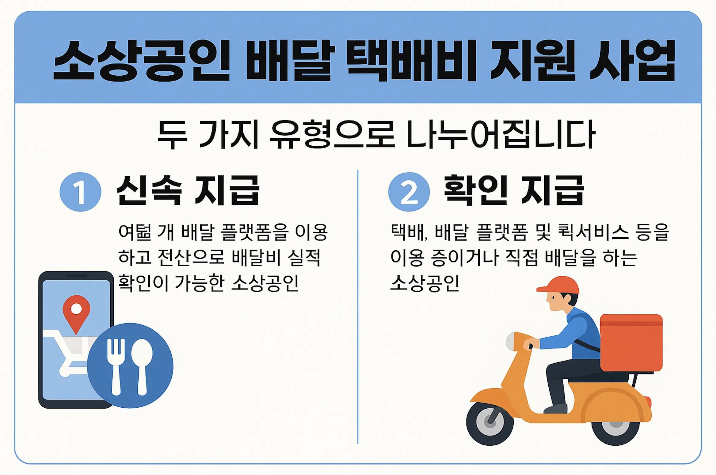 소상공인이라면, 배달이나 택배로 나가는 비용이 만만치 않다는 걸 잘 아실 겁니다. 이런 부담을 덜어드리기 위해 정부가 배달·택배비를 최대 30만 원까지 지원하는 사업을 진행 중인데요. 이 사업은 '신속 지급'과 '확인 지급' 두 가지 방식으로 나뉩니다.