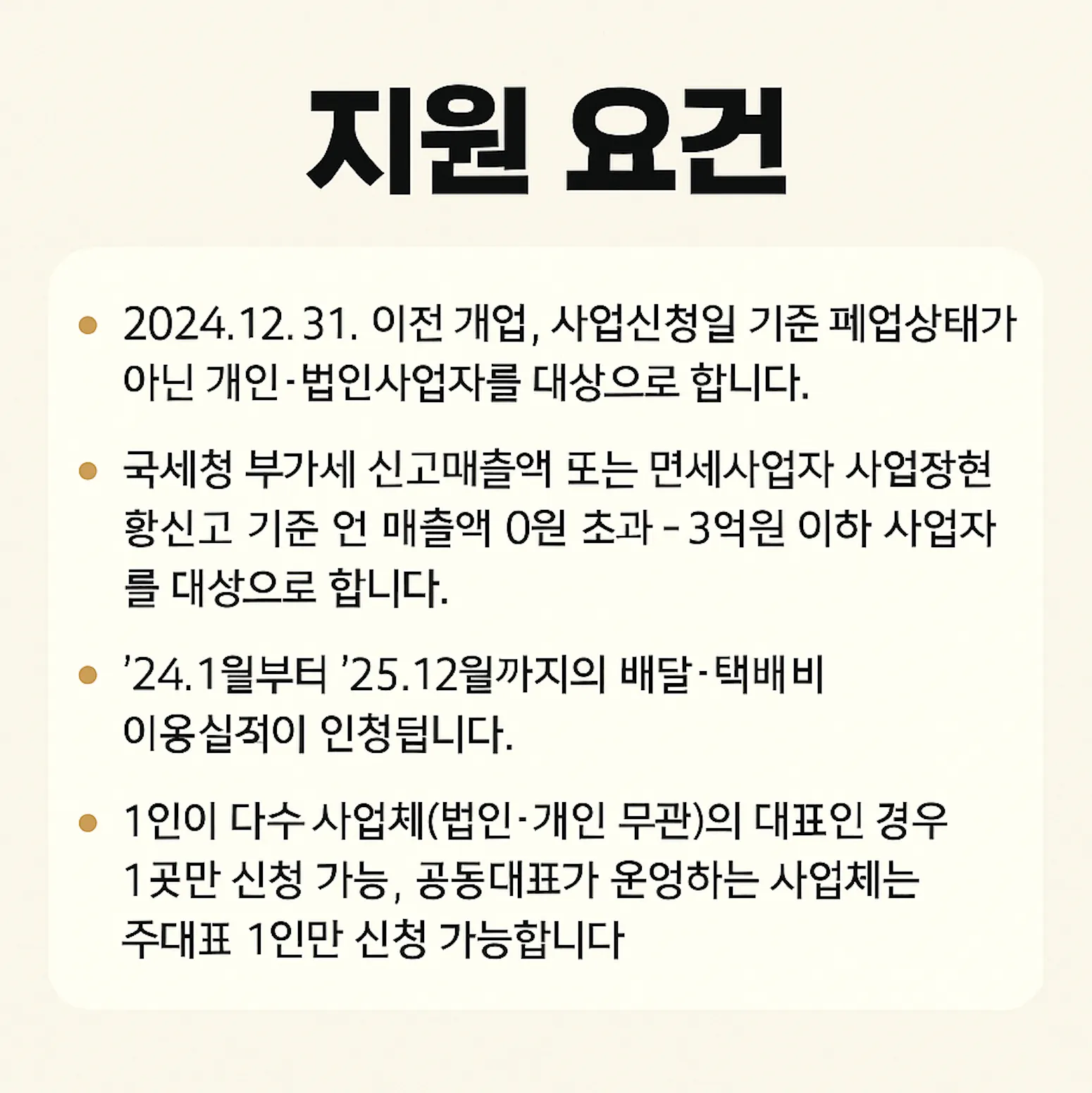 소상공인 배달·택배비 지원 사업은 다음 요건을 모두 충족해야 신청할 수 있습니다.